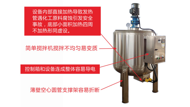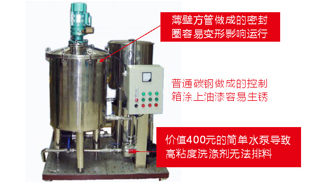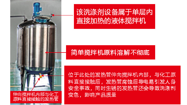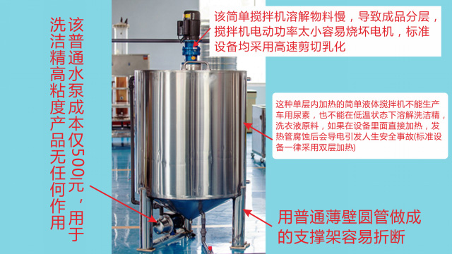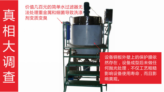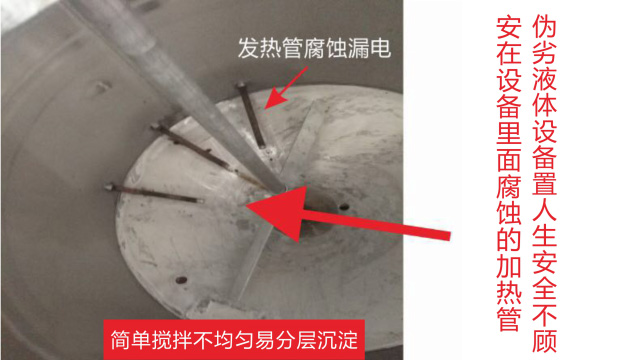 五、項(xiàng)目加盟騙局提供的洗潔精設(shè)備、洗衣液設(shè)備,大都是單層不加熱或單層攪拌機(jī)內(nèi)部用發(fā)熱管直接加熱,當(dāng)燒堿、尿素、磺酸等化工原料長期接觸設(shè)備內(nèi)部的發(fā)熱管后就會(huì)腐蝕,腐蝕后的的銹斑首先會(huì)導(dǎo)致洗滌產(chǎn)品和車用尿素重金屬增加及產(chǎn)品外觀顏色渾濁,還會(huì)引起產(chǎn)品中細(xì)菌滋生變質(zhì)變臭,更嚴(yán)重的是攪拌機(jī)內(nèi)部的發(fā)熱管腐蝕后導(dǎo)電引發(fā)人身安全危機(jī);