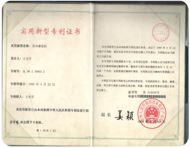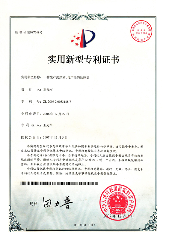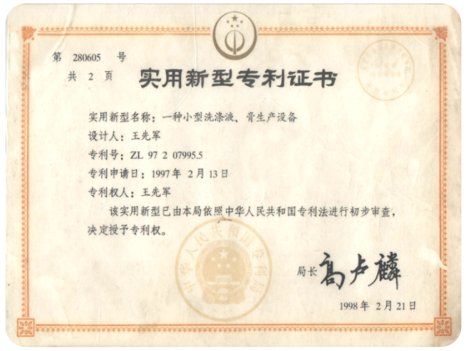 1997年2月曾獲一種小型洗滌液、膏生產(chǎn)設(shè)備國家專利