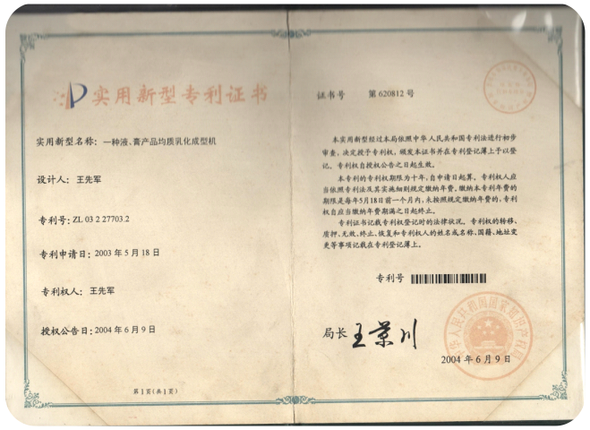2003年5月曾獲液、膏產(chǎn)品均質(zhì)乳化機國家專利