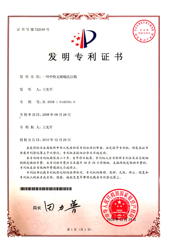 2008年08月曾獲得液體洗滌劑技術(shù)發(fā)明專利
