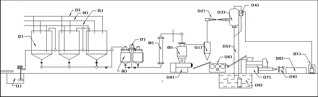 (1) Alkali dissolving tank; (2) Oil saponification pot; (3) Caustic soda pipe valve; (4) Water pipe valve; (5) Steam pipe valve; (6) Batching and blending tank; (7) Bubble alkali tank; (8) Tube heater; (9) Vacuum drying chamber; (10) Vacuum granulator; (11) Cyclone separator; (12) High pressure jet pump; (13) Atmospheric condenser; (14) Steam water separator; (15) Conveyor belt; (16) Three roll grinder; (17) Up and down vacuum stripper; (18) Circulating submersible pump; (19) Block cutting roller printing machine; (20) Finished product conveyor belt; (21) vacuum pump.