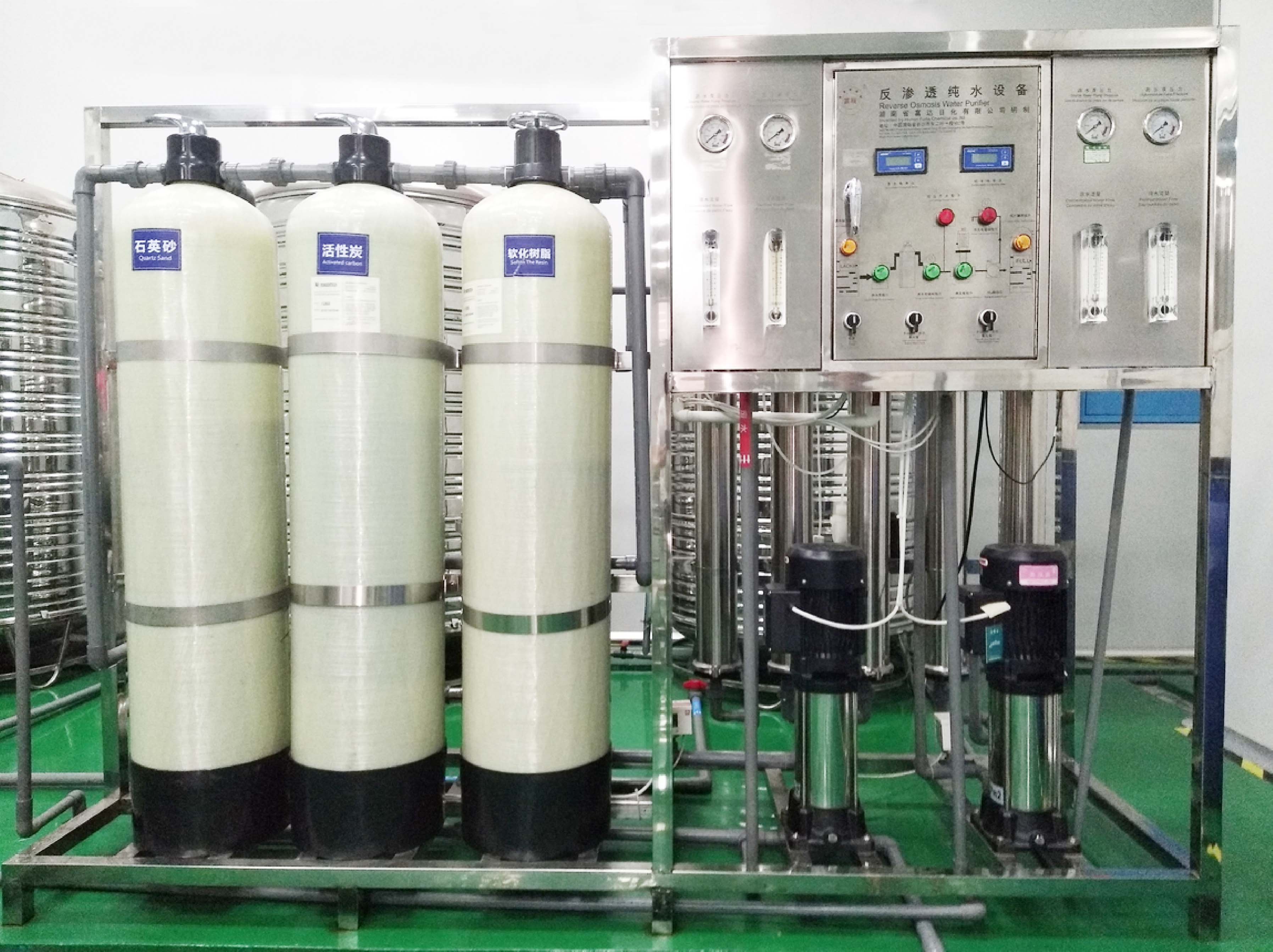 主機(jī)架、原水泵、石英砂過濾器、活性炭過濾器、樹脂過濾器、5級保安過濾器、高壓泵、普通反滲透膜、低壓保護(hù)器、普通二級反滲透膜、積淀過濾器、過載殺菌器。
